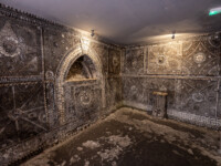 Die riesige Halle in der Grotte de La Verna. Man beachte die gelben und orangen 'Punkte', die mannsgrosse Puppen sind.